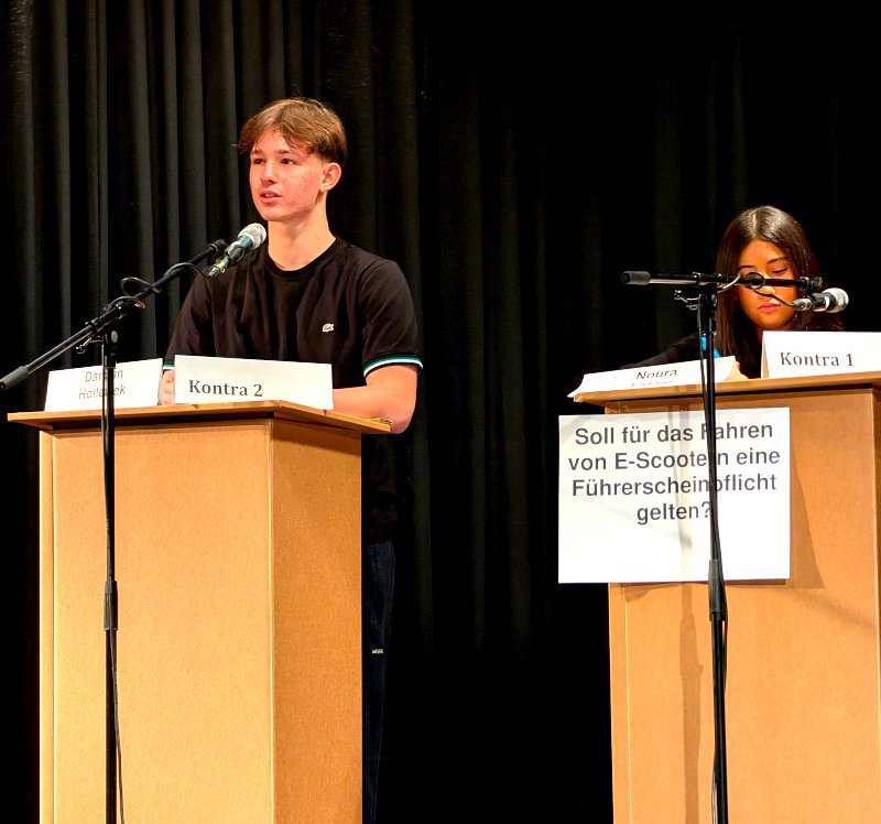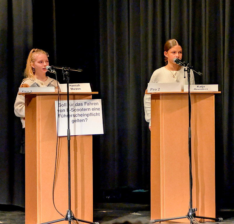 Wer in den Qualifikationsrunden zu den Debattenthemen in den Bereichen Klimaschutz und digitale Gerechtigkeit (Altersstufe I) sowie KI bei schriftlichen Prüfungen und Online-Bezahlmodellen (Altersstufe II) überzeugte, konnte sich einen Platz im Finale sichern. Erneut hat sich gezeigt, dass das Gymnasium Allermöhe sich sehen lassen kann, denn mit Noura und Milan war unsere Schule gleich in beiden Jahrgangsstufen im Finale des Regionalwettbewerbs vertreten! Beide belegten einen starken vierten Platz, nachdem sie über die Veröffentlichung von Wahlumfragen vor Wahlen bzw. über Kontaktgebühren für Arztbesuche debattiert hatten.