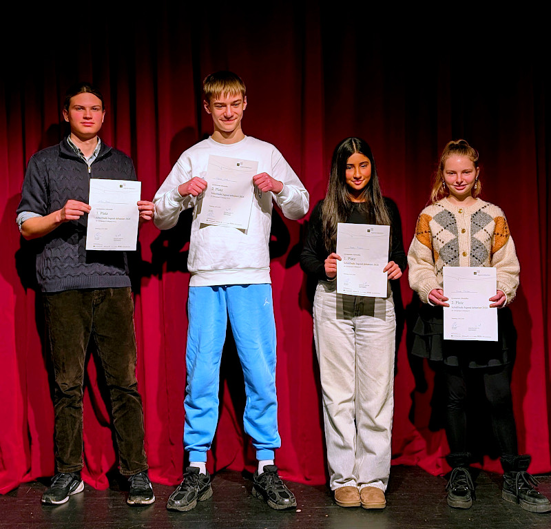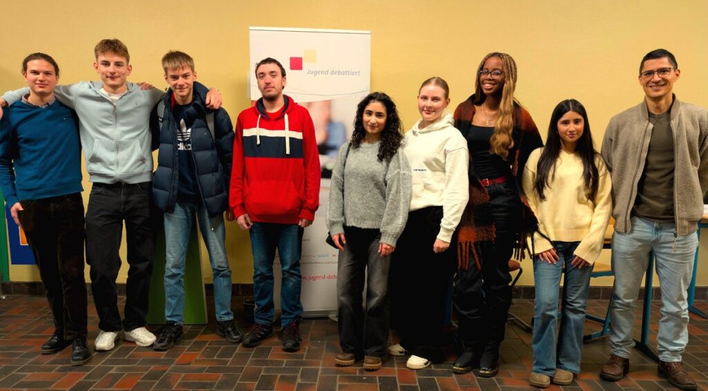 Unsere ausgewählten DebattantInnen Hannah, Noura, Milan und Fabian stellten sich am 12.02.2026 dann am Friedrich-Ebert-Gymnasium der Konkurrenz aus acht weiteren Schulen. Begleitet und unterstützt wurden sie dabei von unserer Delegation aus ausgebildeten JurorInnen und NachrückerInnen und Herrn Ernst.