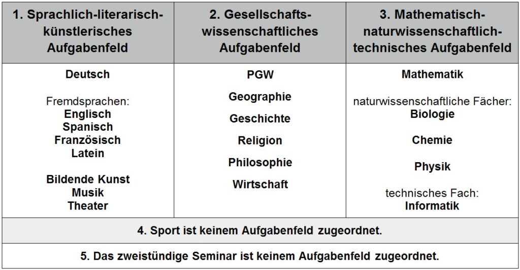 Diese Übersicht zeigt, welche Fächer, die an unserer Schule unterrichtet werden, zu welchen Aufgabenfeldern zugeordnet werden.
